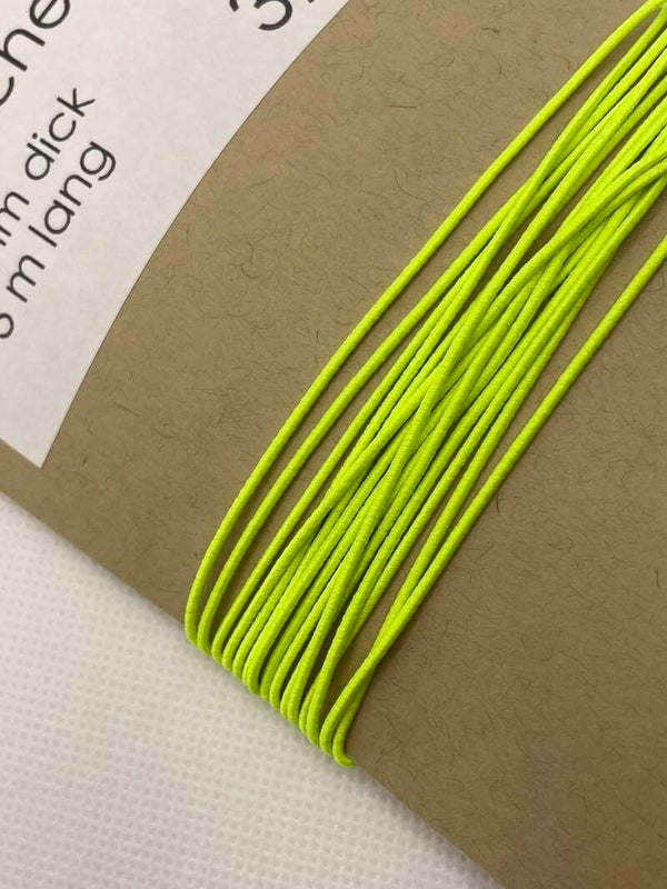 Bringe Farbe in deine DIY-Projekte! Mit diesem elastischen Band in Neongelb, 1mm stark, dass vielseitig einsetzbar ist: ideal zum Verpacken von Geschenken, für Armbänder, Schmuckherstellung, Bastelarbeiten oder zum Verschließen kleiner Beutel.
