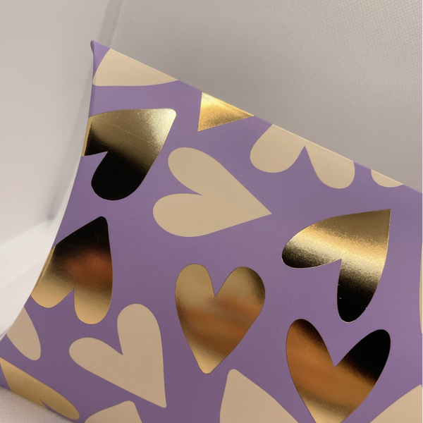 Die Kissenschachtel mit Herzmotiv in Lila und Gold ist die perfekte Verpackung für kleine Schmuckstücke, Süßigkeiten oder besondere Mitbringsel.