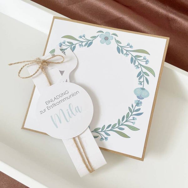 Diese Einladungskarte verbindet traditionelles Symbol mit moderner Individualität und eignet sich perfekt als stilvolle Einladung zur Kommunion.
