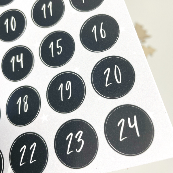 Gestalte deinen Adventskalender stilvoll und individuell – mit diesen hochwertigen Adventskalenderzahlen-Stickern in edlen Farbkombinationen!